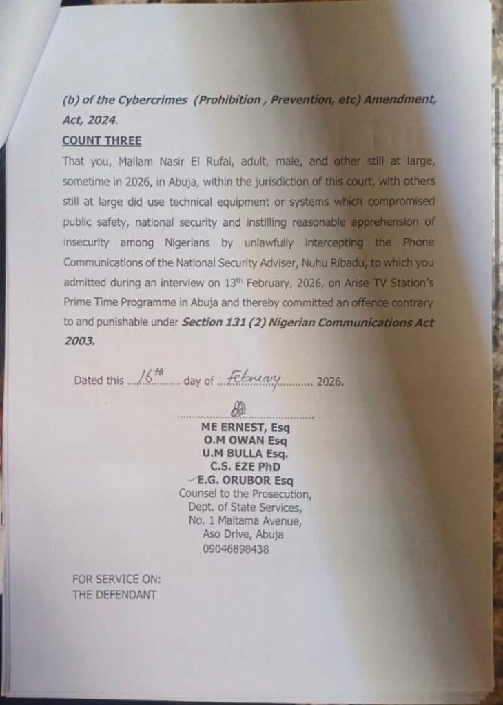 The Department of State Services (DSS) has filed cybercrime charges against former Kaduna State Governor Nasir El-Rufai at the Federal High Court in Abuja, accusing him of involvement in the unlawful interception of phone communications belonging to National Security Adviser Nuhu Ribadu.