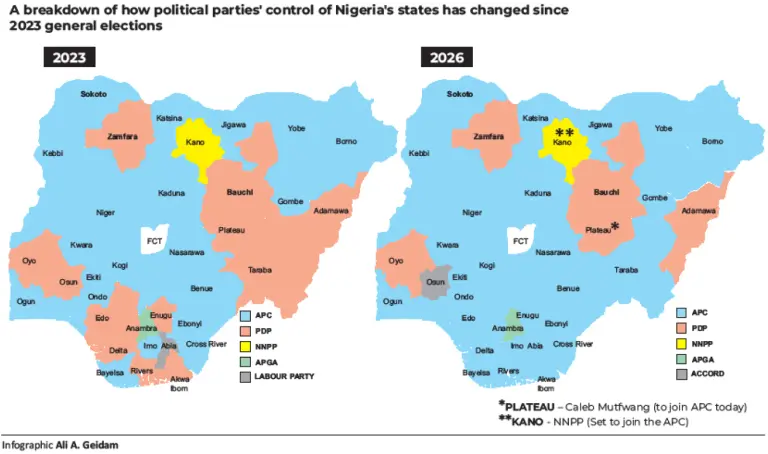 Unlike the PDP’s rise, the APC’s growth from having 20 governors after the 2023 elections has largely been driven by defections from opposition parties, raising concerns about the concentration of power and the potential drift toward a one-party dominance