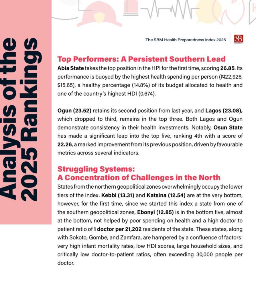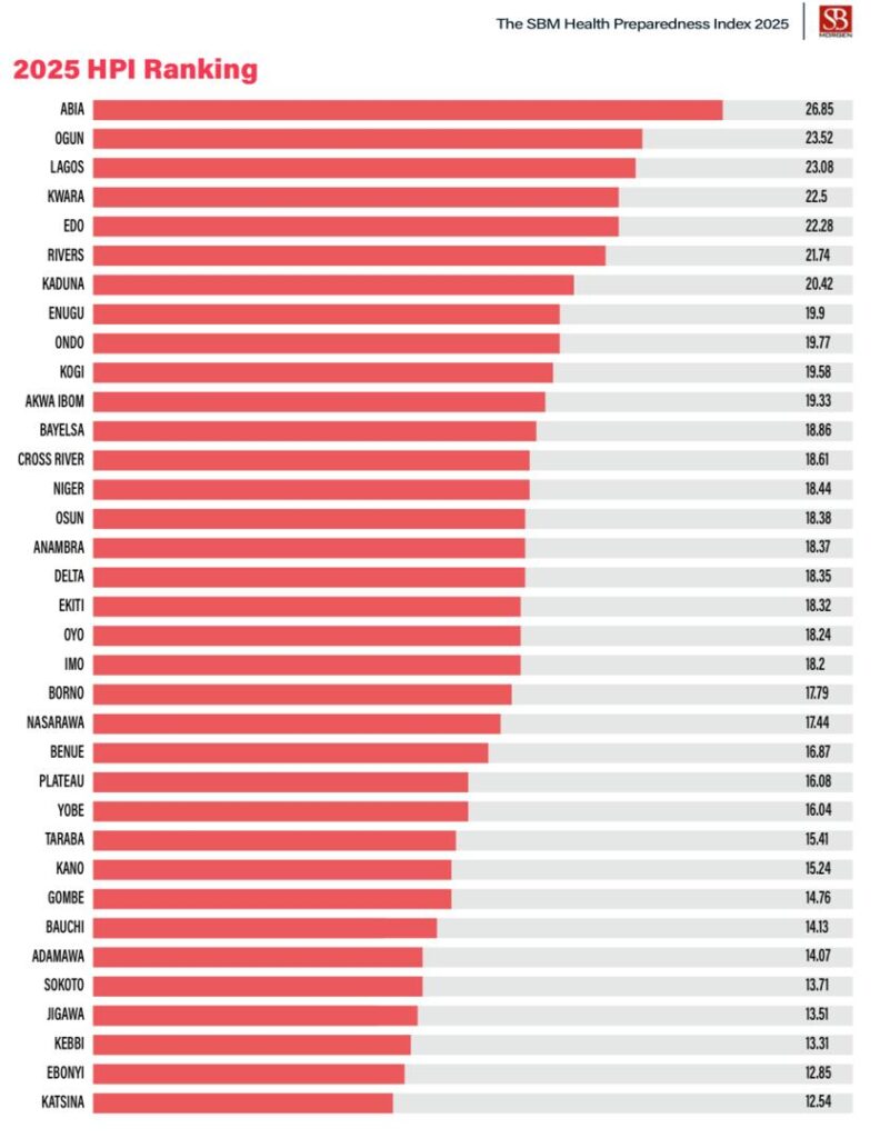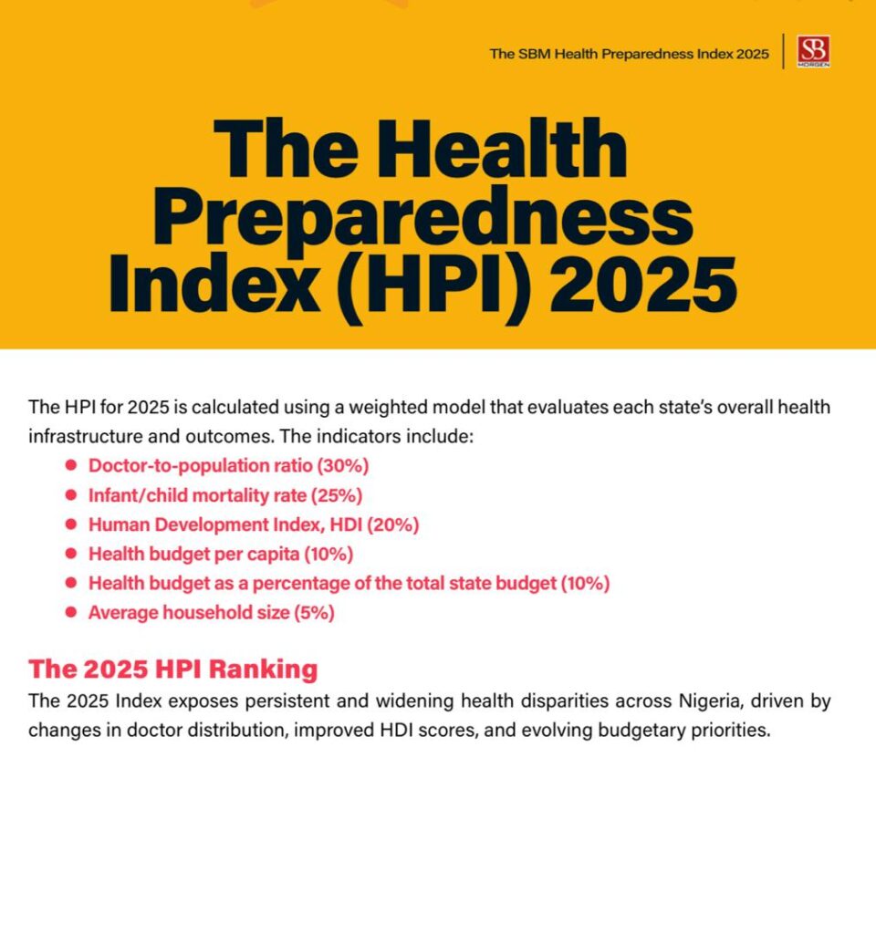 The SBM Health Preparedness Index assesses the capacity of Nigeria’s 36 states to effectively respond to health emergencies and deliver quality healthcare services. The annual report draws data from credible national and international institutions including the National Bureau of Statistics (NBS), World Health Organisation (WHO), The Lancet, Nigeria Demographic and Health Survey (NDHS), BudgIT, The Cable, the Faculty of Medical Sciences of Radboud University, and the Global Data Lab.