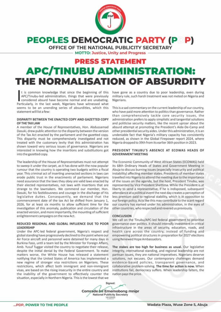 “The PDP commended Hon. Dasuki for his vigilance and demanded a six-month postponement of the Tax Act’s commencement date, originally set for January 1, 2026, to allow time for a thorough probe, publication of the correct enacted version, and public enlightenment campaigns.