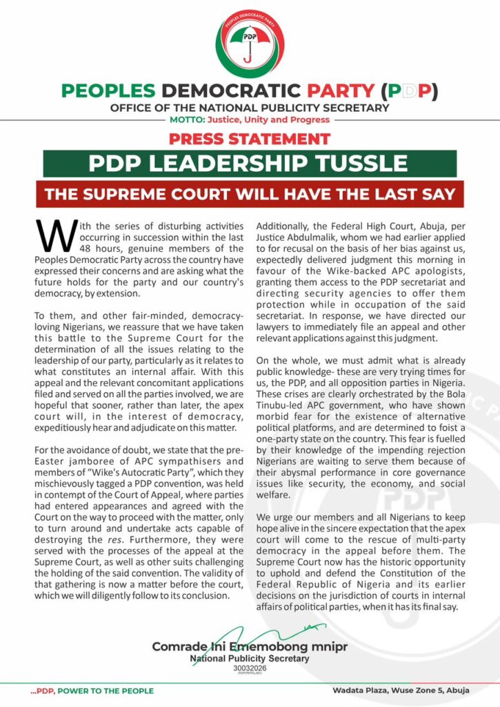 The faction urged PDP members and Nigerians to remain hopeful, stating that the Supreme Court now has a historic opportunity to uphold the Constitution and its previous decisions on the jurisdiction of courts in the internal affairs of political parties.