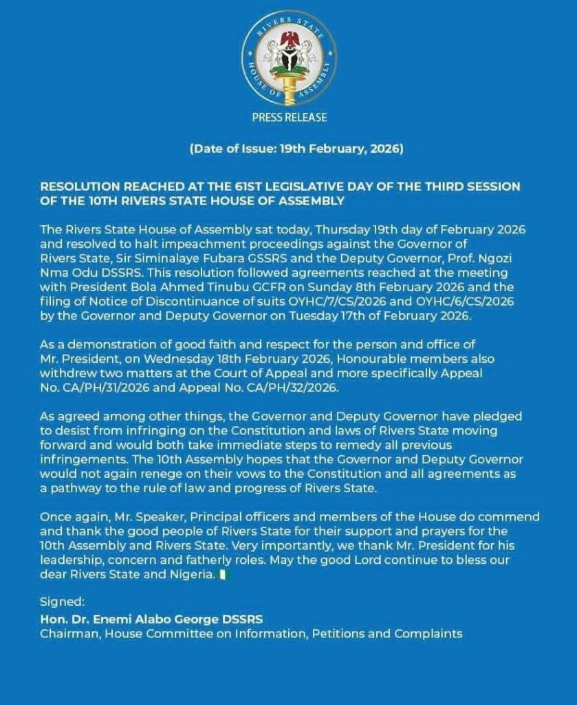 Lawmakers said the notice of allegations was issued under Section 188 of the 1999 Constitution (as amended).In a letter dated January 16, 2026, the Assembly asked the state Chief Judge, Justice Simeon Amadi, to constitute a seven-member panel to investigate the allegations.